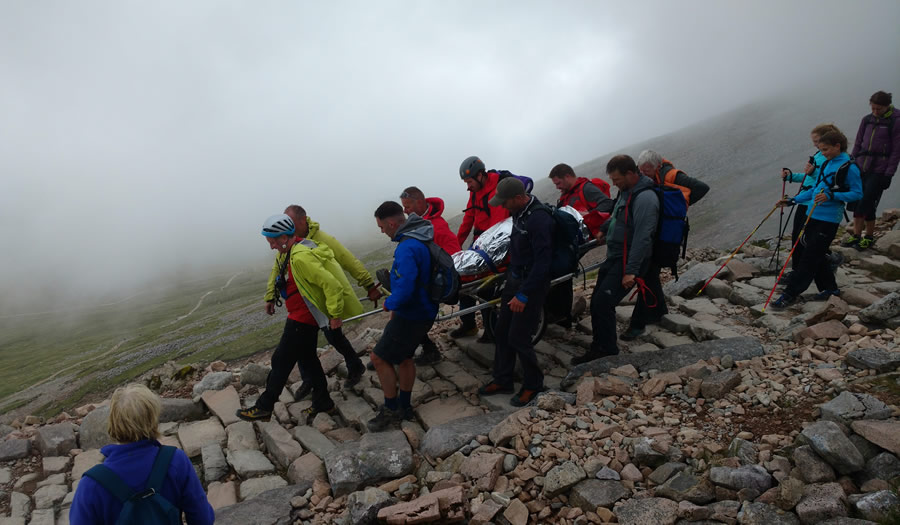 While walking down from Ben Nevis we 3 became witness to a live Mountain Rescue event with an injured hiker on a stretcher being taken down the mountain, and later being